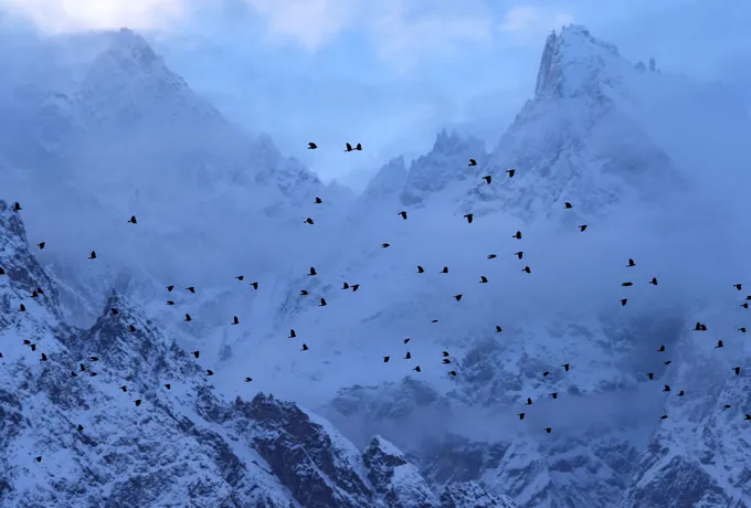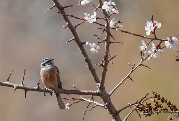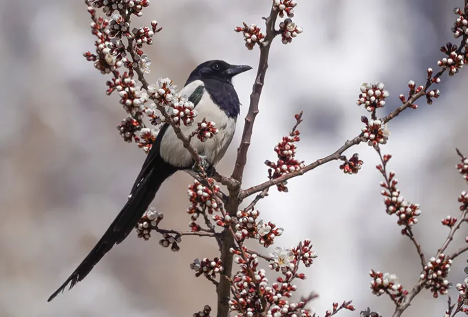 Along the Pamir River and in the villages around the orchards, there are so many wild birds. For example, the Eurasian Magpie might be found in the village, or in the orchards and among the willow forests along the riverside one might see Fire-fronted Serin, White-winged Redstart, Wallcreeper, Common Rosefinch, and the Mongolian Finch. In the winter, Snow Pigeons and the Himalayan Snowcock come down from the highlands.